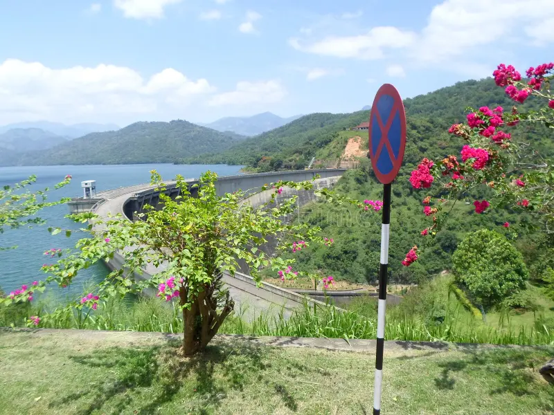 A scenic dam at one end of the lake with a beautiful terraced garden and temple complex, offering peaceful lake views.